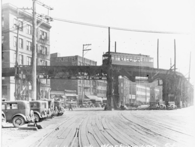 Looking south on Railroad Avenue with Seattle Municipal Railway streetcar turning east on Washington Street ramp, July 20, 1929 ( Pacific Northwest Railroad Archive ). This ramp was removed in the...